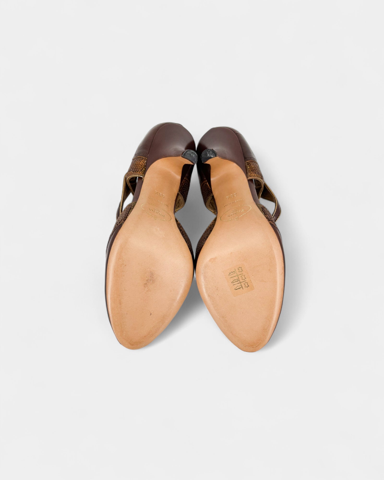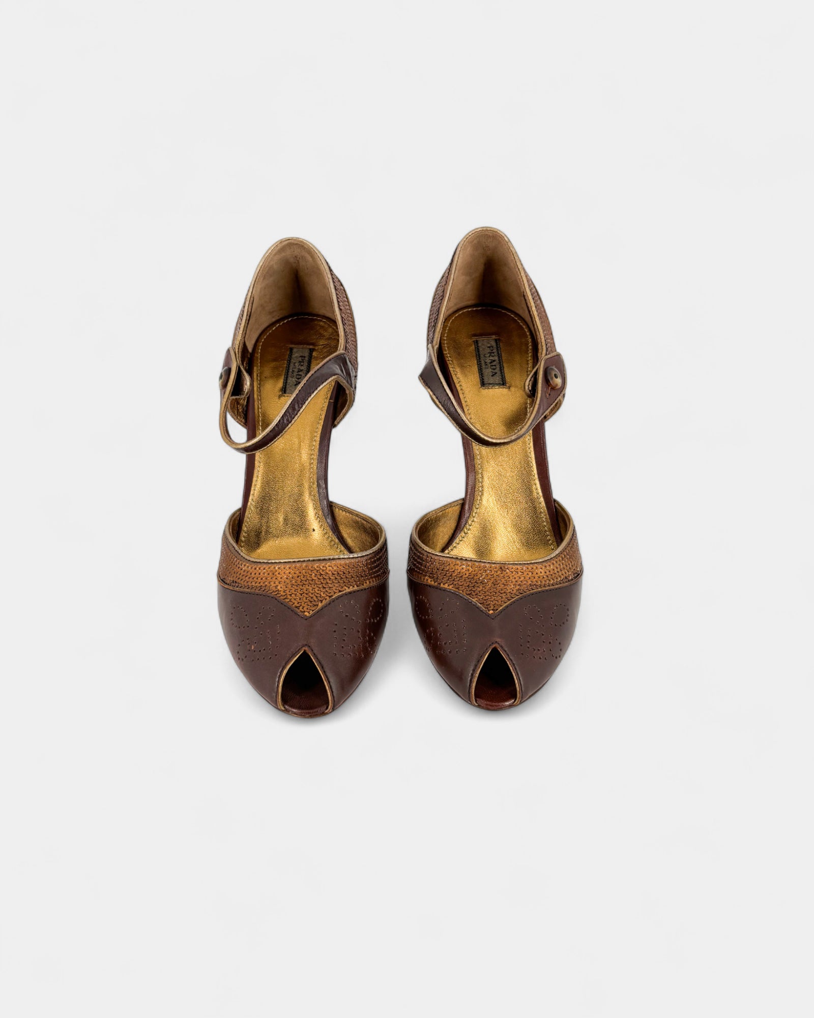 Open-toe pumps in brown leather and gold sequins