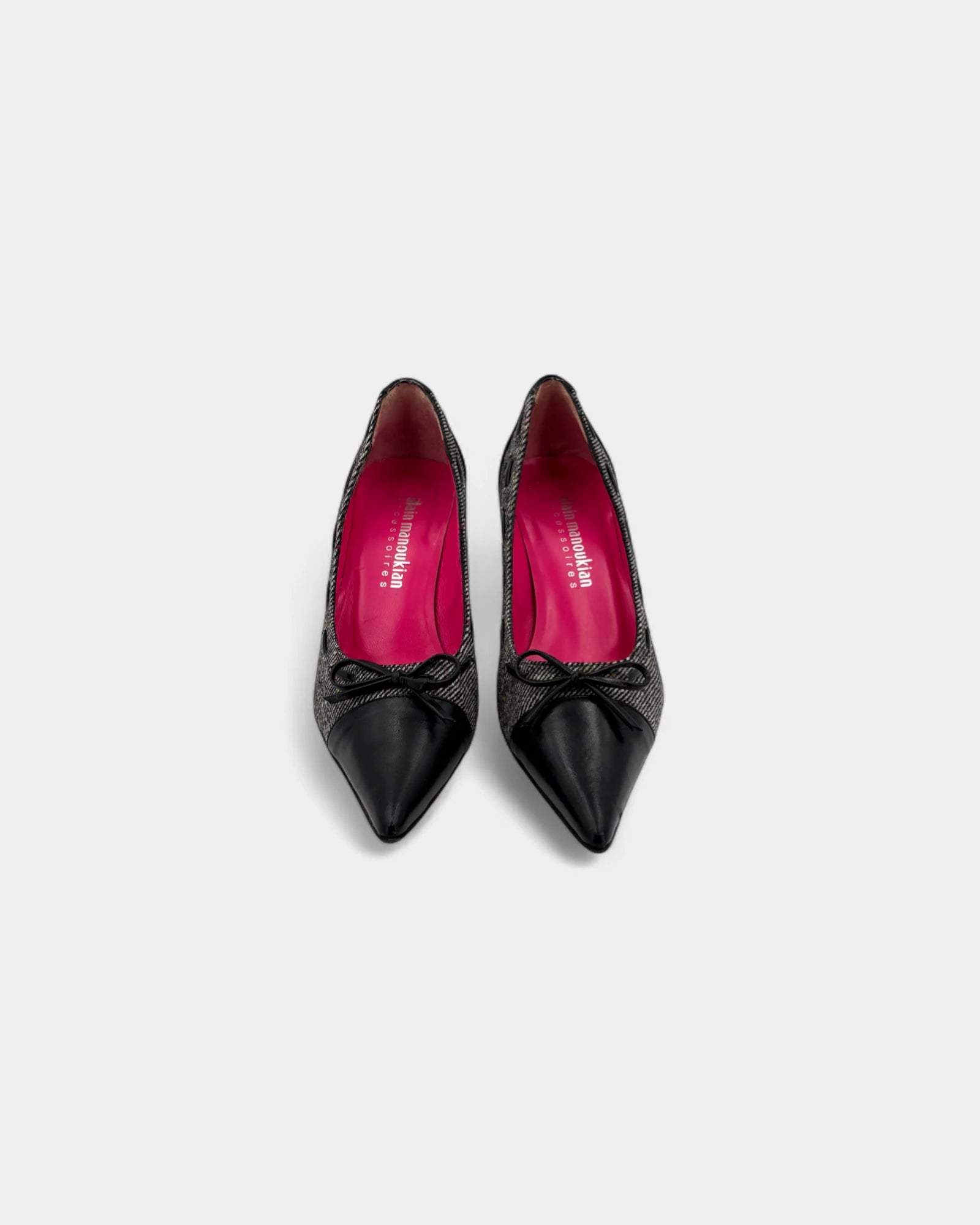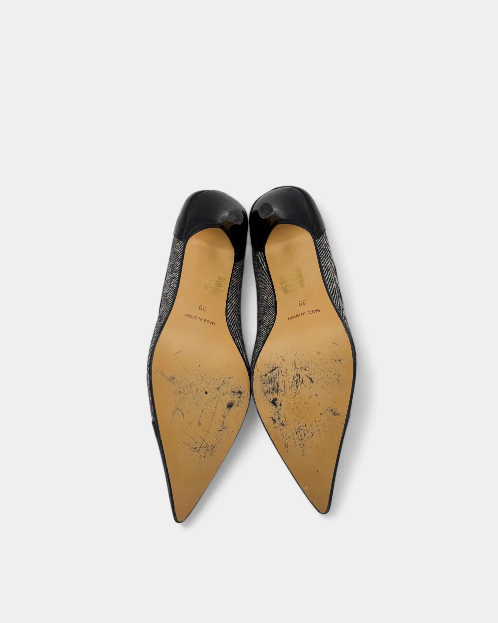 grey and black fabric pumps
