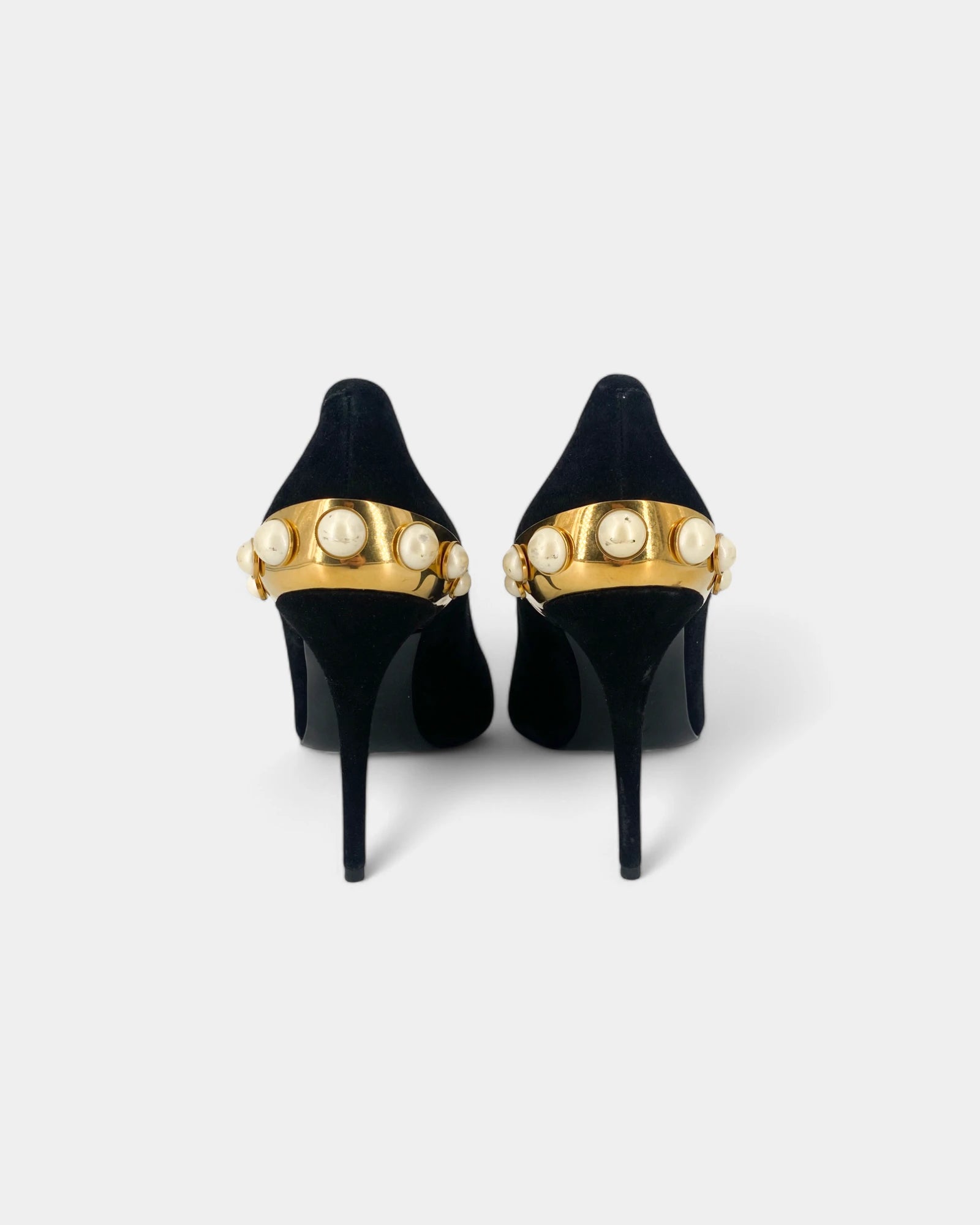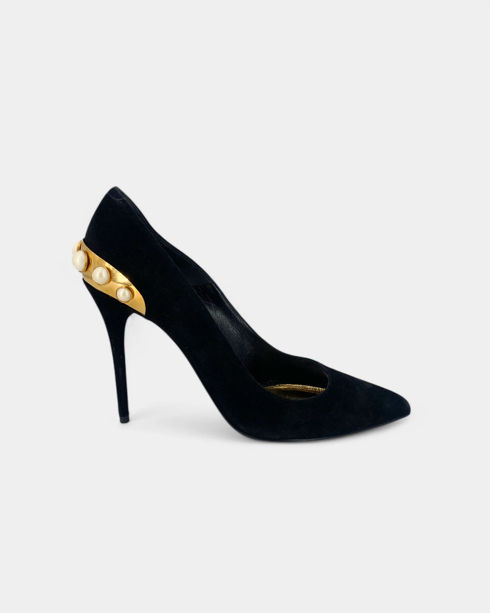 Escarpins noirs en daim à bijou doré et perles