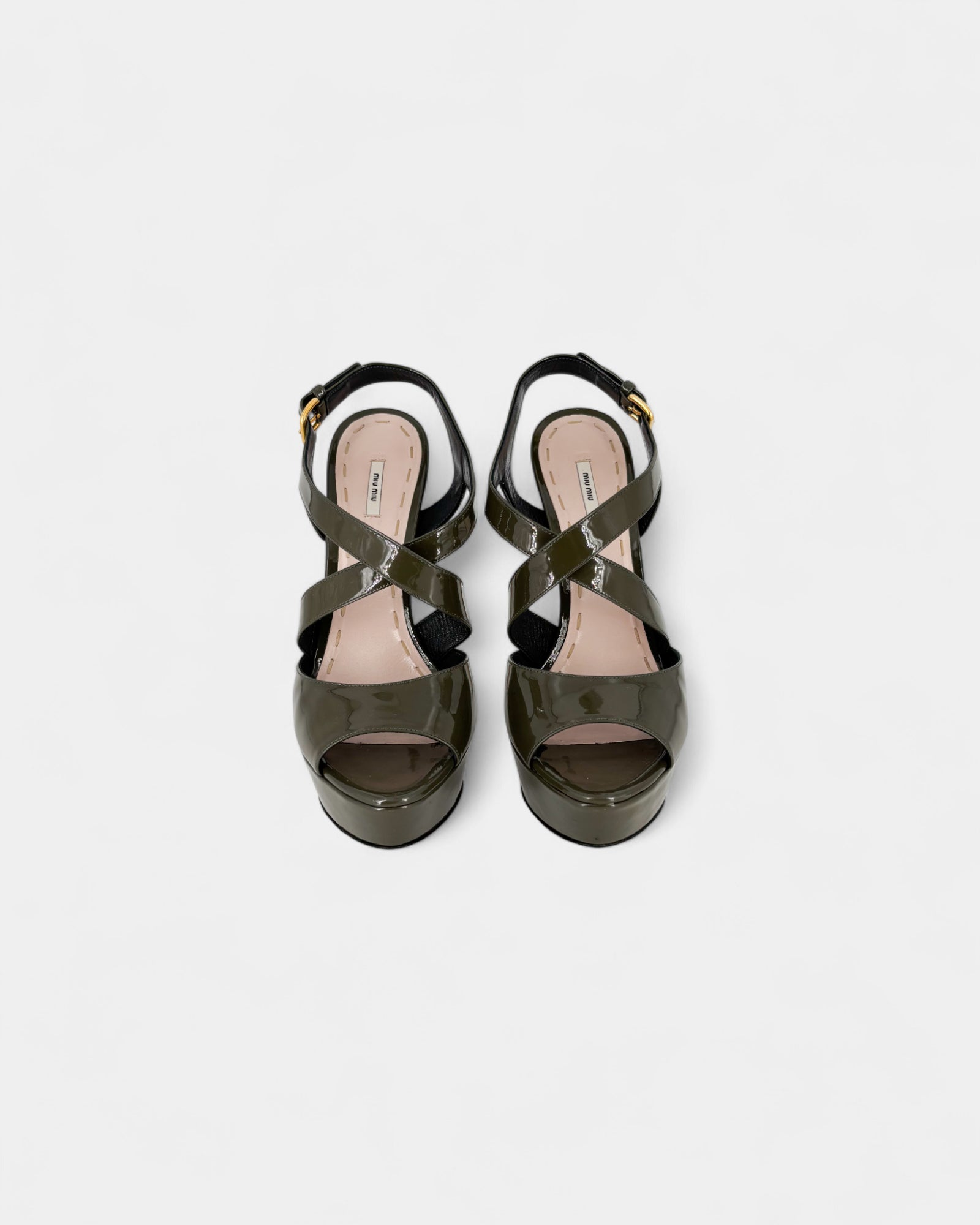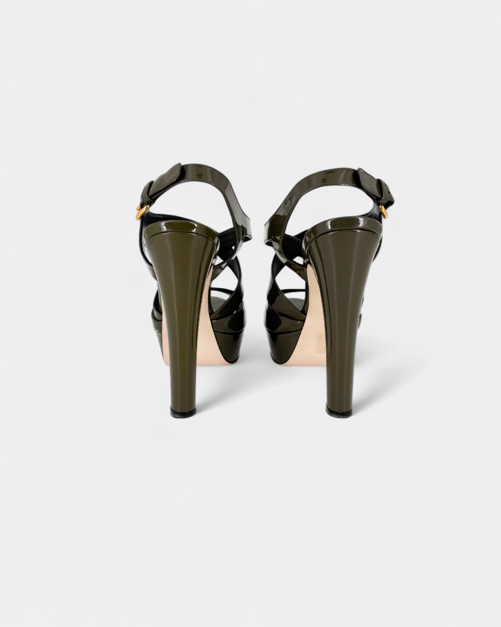 Sandales en cuir verni kaki à talon