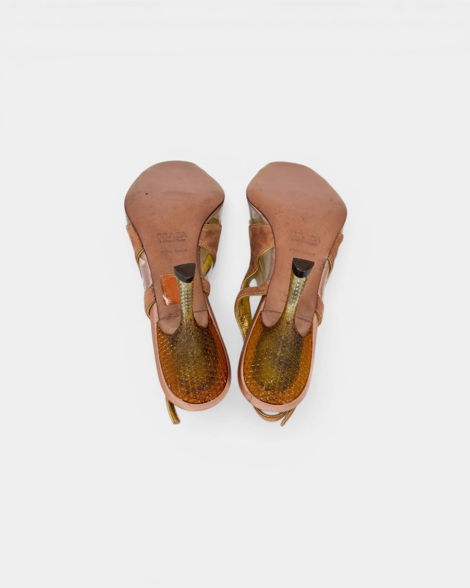 Sandales en cuir beige et doré à empiècements transparents